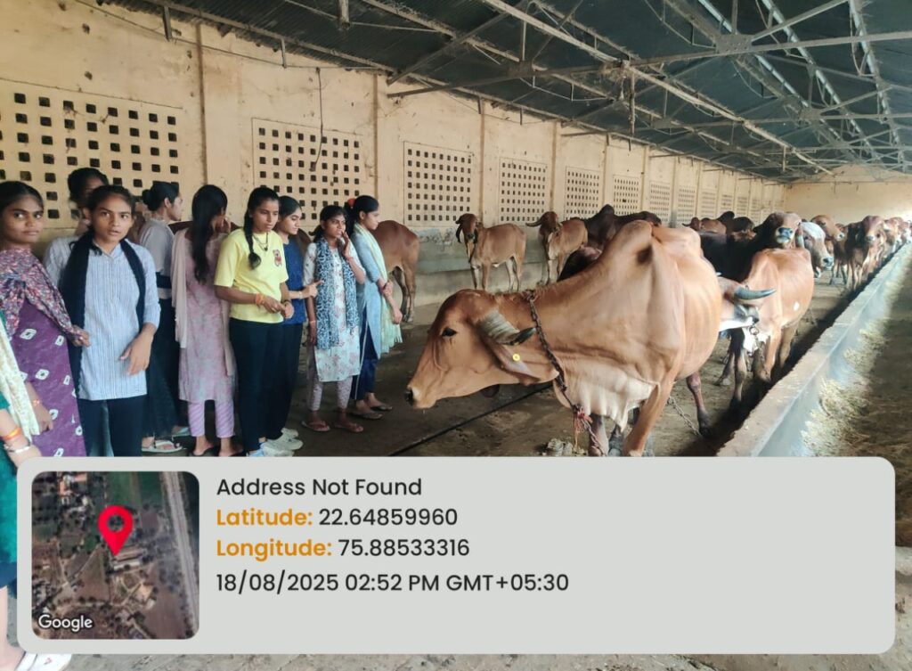 दिनांक 18/8/25 – गौशाला भ्रमण के दौरान विद्यार्थियों ने गायों की देखभाल की प्रक्रिया को जाना और सेवा भावना का अनुभव किया।